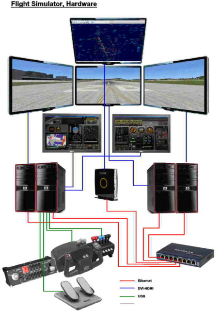 4 LCD 32 Zoll TV's mit Full HD Auflösung. 2 LCD Monitore 17 Zoll. 4 PC's, Intel i7, 2.6 GHz und 8 GB RAM. 1 Mini-PC, Intel Atom 1.6 GHz und 2 GB RAM LAN mit Netgear Switch und Internet Anbindung. Steuerhorn, Throttle